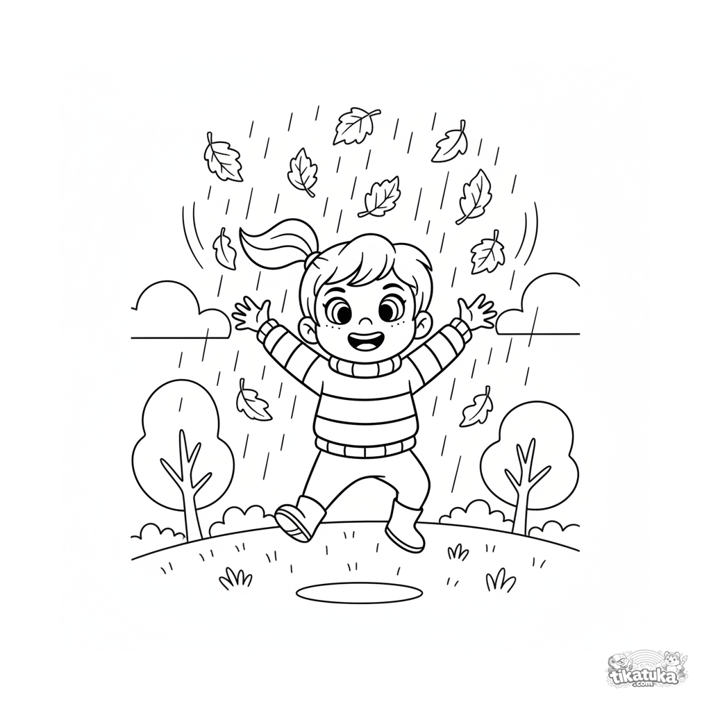 Página para colorir para crianças de 4-6 anos: uma criança com botas pula alegremente, pegando folhas de outono caindo na chuva. Detalhe moderado, pose dinâmica.