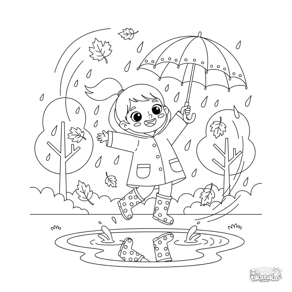 Página para colorir para crianças de 4-6 anos: uma criança alegre com botas e guarda-chuva pega folhas coloridas de outono na chuva. Cena dinâmica e brilhante com contornos claros.