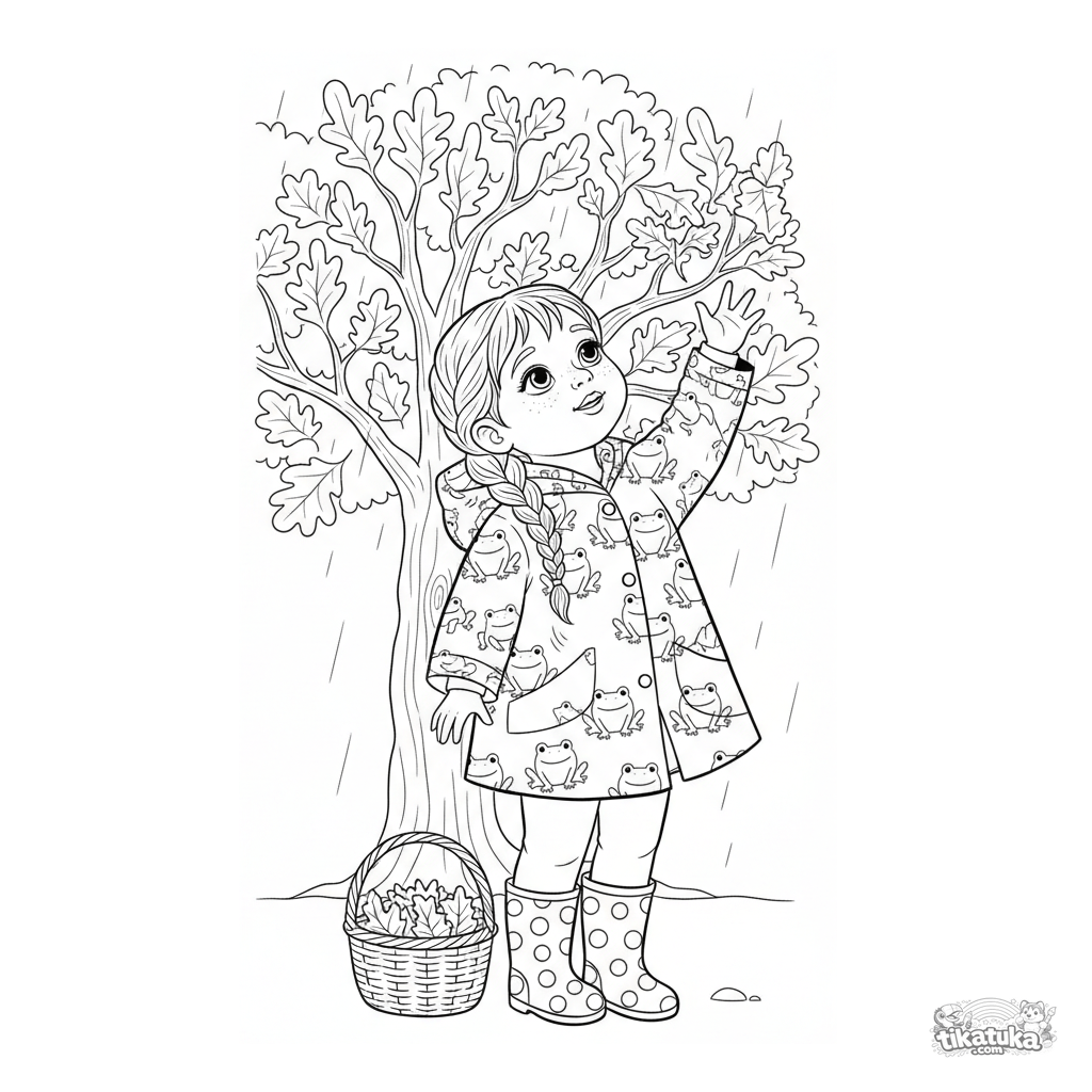 Página para colorir para crianças 7-9: uma criança de capa de chuva e botas pegando folhas molhadas caindo sob um carvalho de outono.