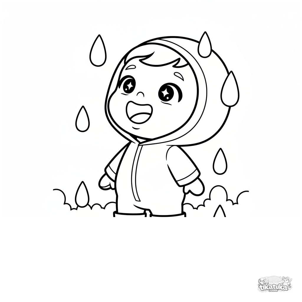 Página para colorir para crianças de 2-3 anos: um bebê engraçado de macacão e botas pega gotas de chuva de outono com a língua. Formas simples e grandes.