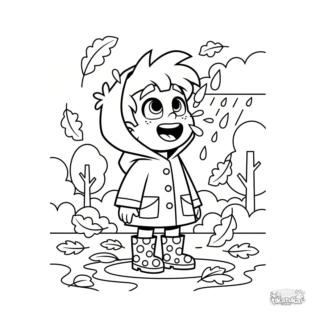 Página para colorir para crianças de 7-9 anos: uma criança com uma capa de chuva brilhante tenta pegar gotas de chuva outonal com a língua. Pose expressiva.