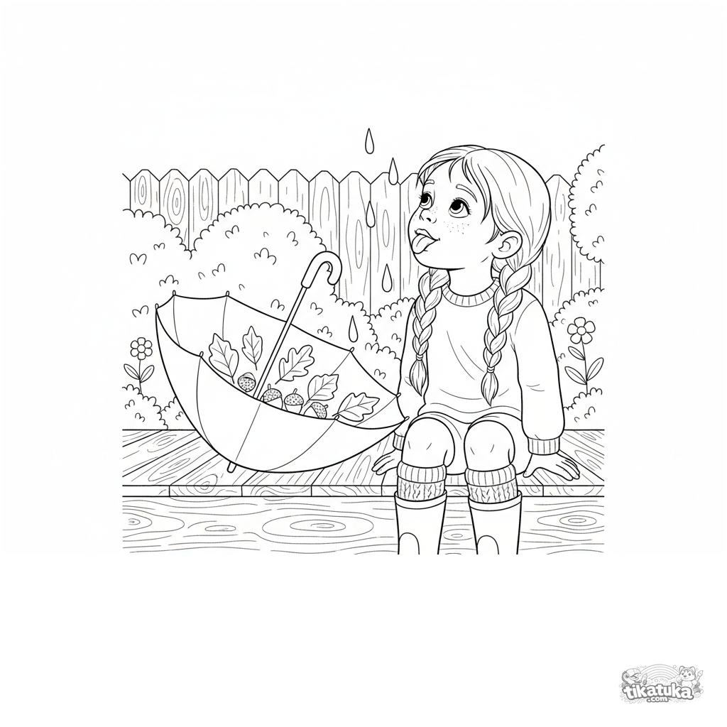 Página para colorir para pré-adolescentes de 7-9 anos: uma menina de meias e botas na varanda pegando gotas de chuva outonal com a língua. Cena calorosa e detalhada com clima.