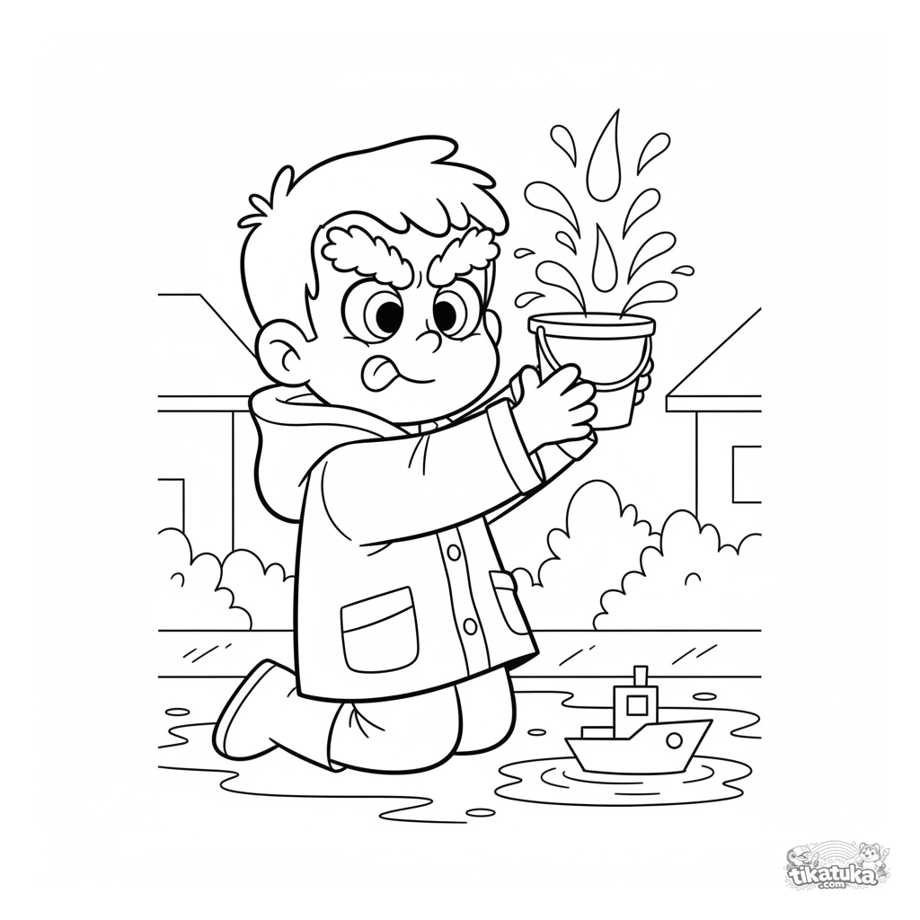 Página para colorir para crianças 4-6: uma criança brincalhona com capa de chuva amarela ajoelha-se na calçada molhada, tentando pegar pingos de chuva em um baldinho no outono.