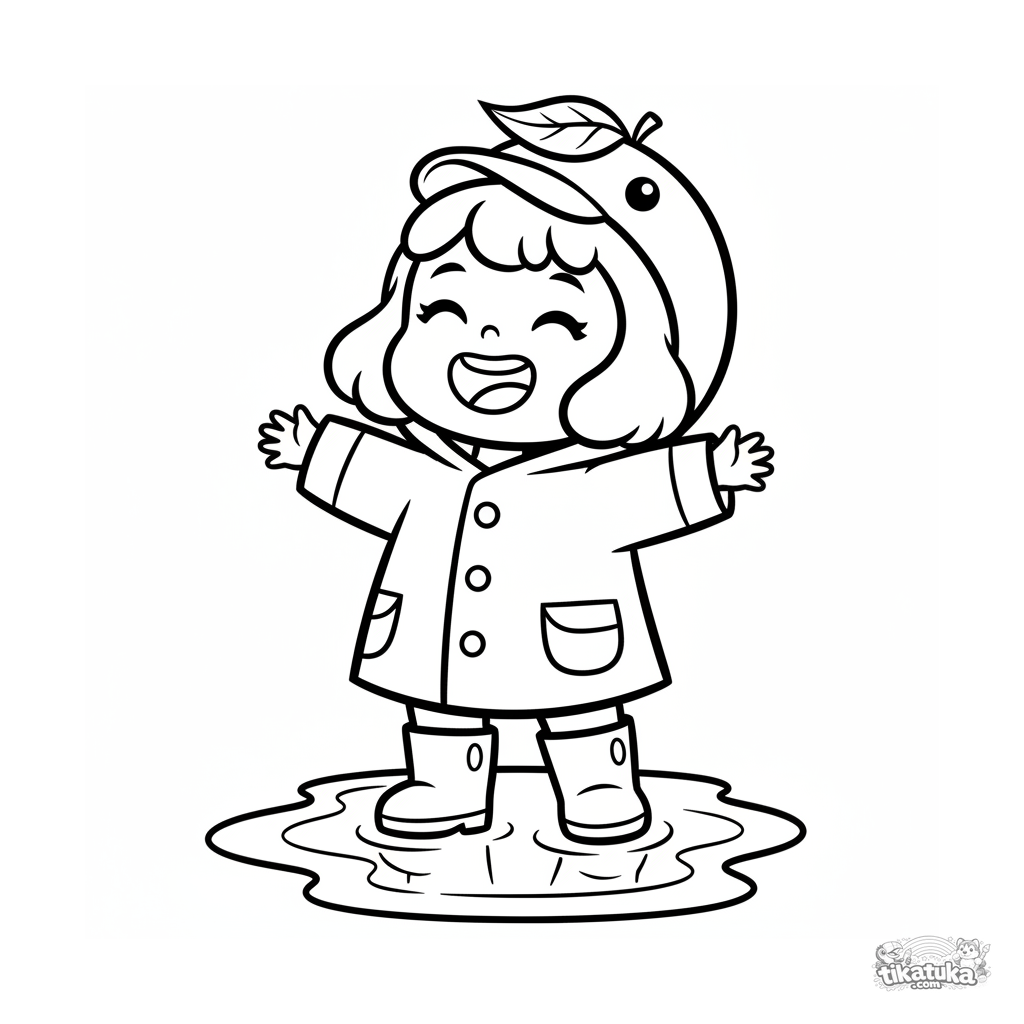Página simples para colorir para crianças pequenas 2-3 anos: uma criança de capa de chuva de pato pega gotas de chuva. Grandes áreas abertas.