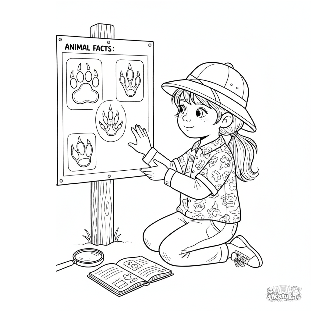 Página para colorir para crianças 10-12: uma criança estuda e compara pegadas de animais em um quadro educativo no zoológico. Cena de aprendizado científico detalhada.