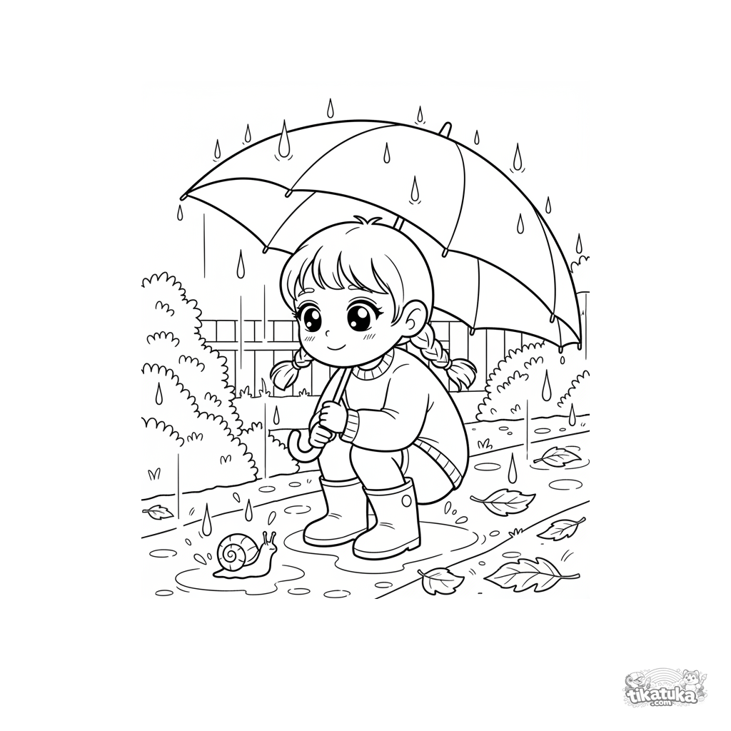 Página para colorir para crianças 4-6: uma criança bondosa de botas agacha-se no caminho segurando um guarda-chuva para um caracol.
