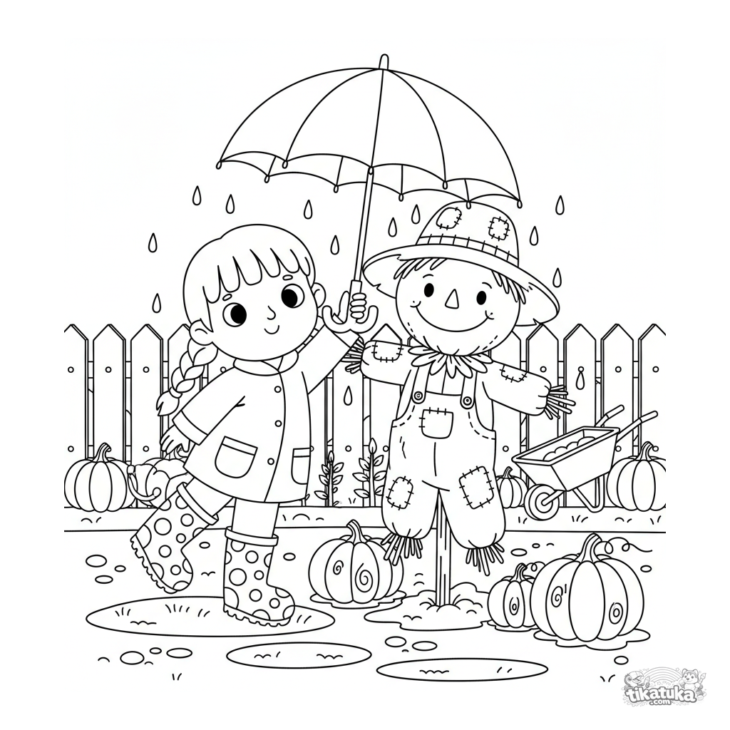 Página para colorir para crianças de 4-6 anos: uma criança com botas de sapo compartilha seu guarda-chuva com um espantalho sorridente em um jardim de outono. Cena doce e bondosa com abóboras e chuva.