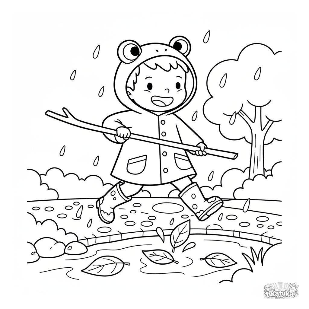 Página para colorir para crianças pequenas de 2-3 anos: uma criança alegre de botas e capa de chuva de sapo pula sobre um riacho após a chuva. Formas muito simples e grandes.