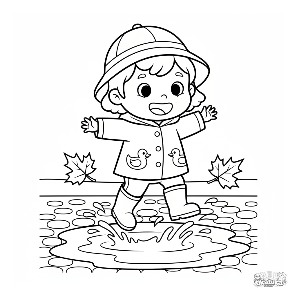 Página para colorir para crianças de 2-3 anos: uma criança alegre com botas de chuva pula em uma poça de outono. Formas grandes e simples.