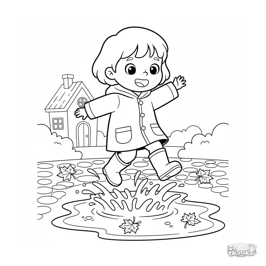 Página para colorir para crianças 4-6: uma criança alegre com capa de chuva e botas pula em uma poça de outono com folhas flutuantes. Contornos claros.