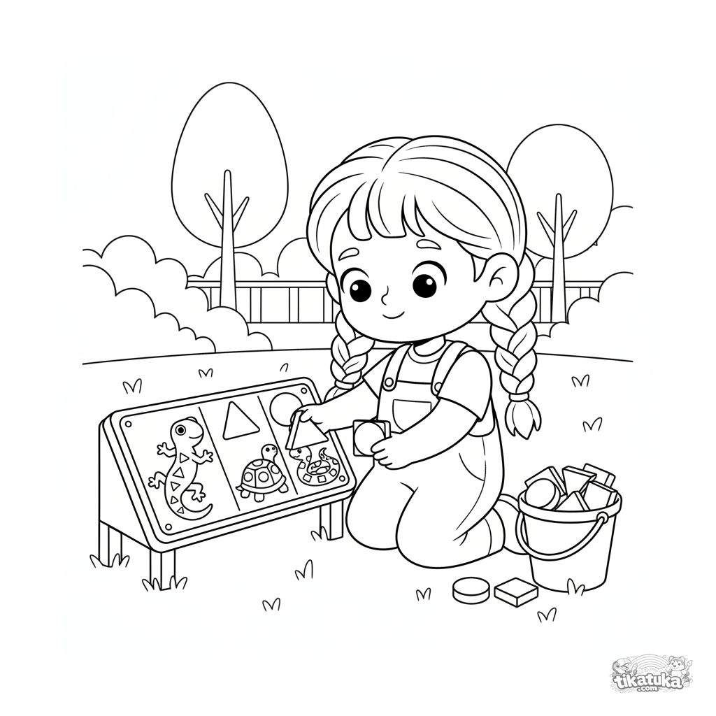 Página para colorir para crianças de 4-6 anos. Uma criança ajoelhada combina formas com contornos num painel interativo de répteis baixo no zoológico.