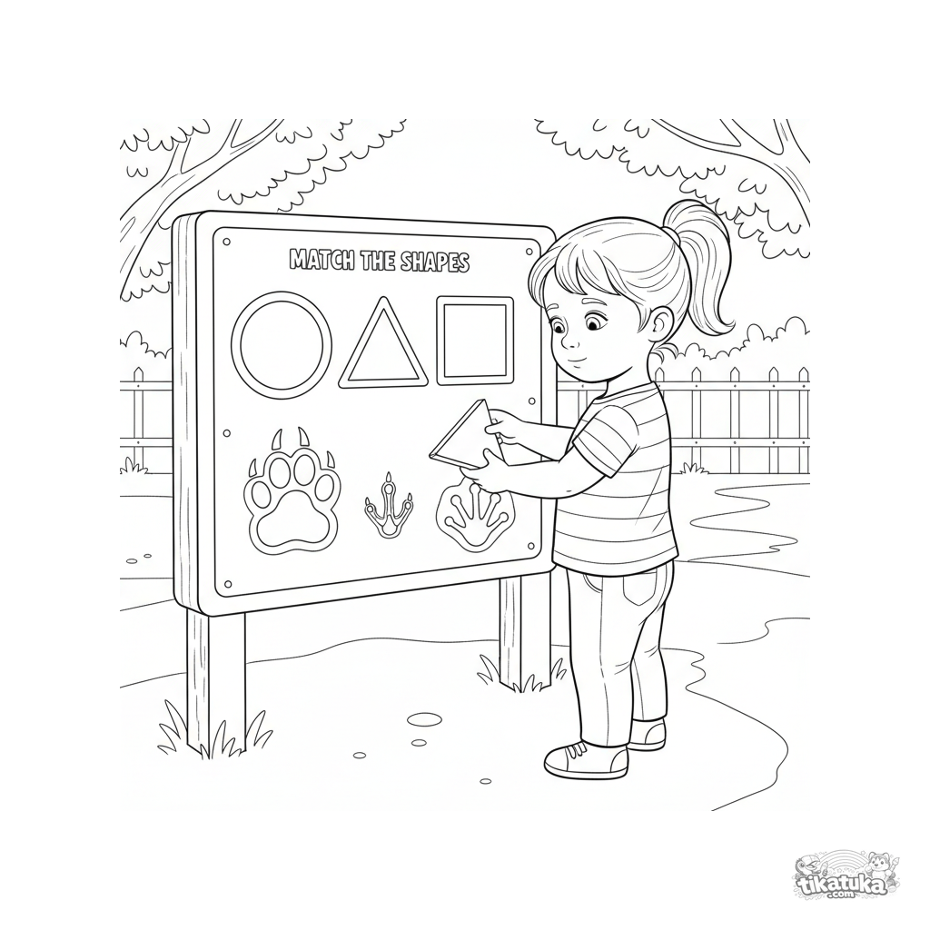 Página para colorir para crianças de 4-6 anos: uma criança combina formas geométricas com pegadas de animais em um quadro interativo do zoológico. Jogo educativo de reconhecimento de formas.
