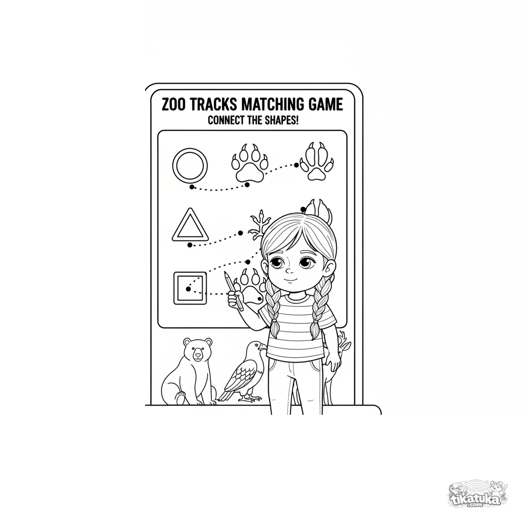 Página para colorir para crianças 4-6: uma criança em um painel do zoológico joga combinando formas geométricas com pegadas de animais. Cena educativa para aprender formas e natureza.