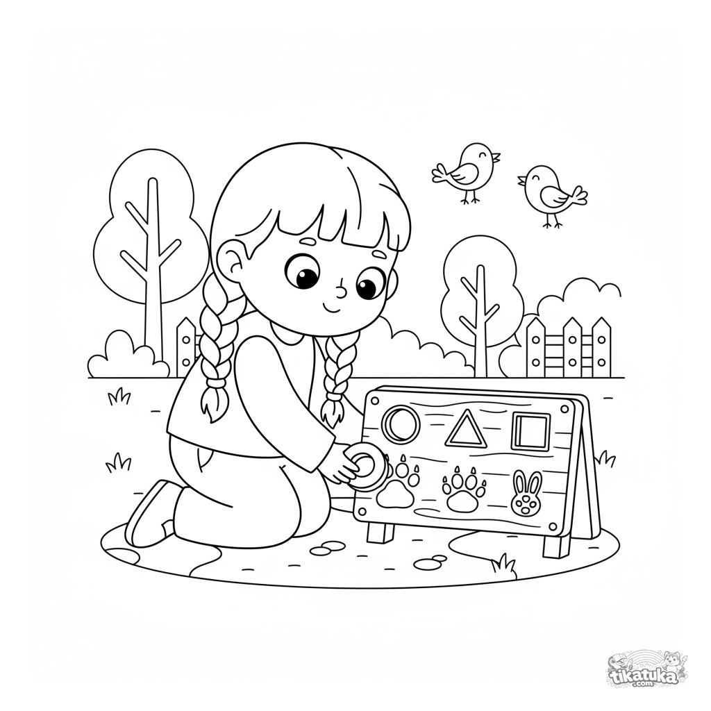 Página para colorir para crianças de 4-6 anos: uma criança brinca com uma placa interativa, combinando formas geométricas com impressões de pegadas de animais no zoológico. Aprendizado através da brincadeira.