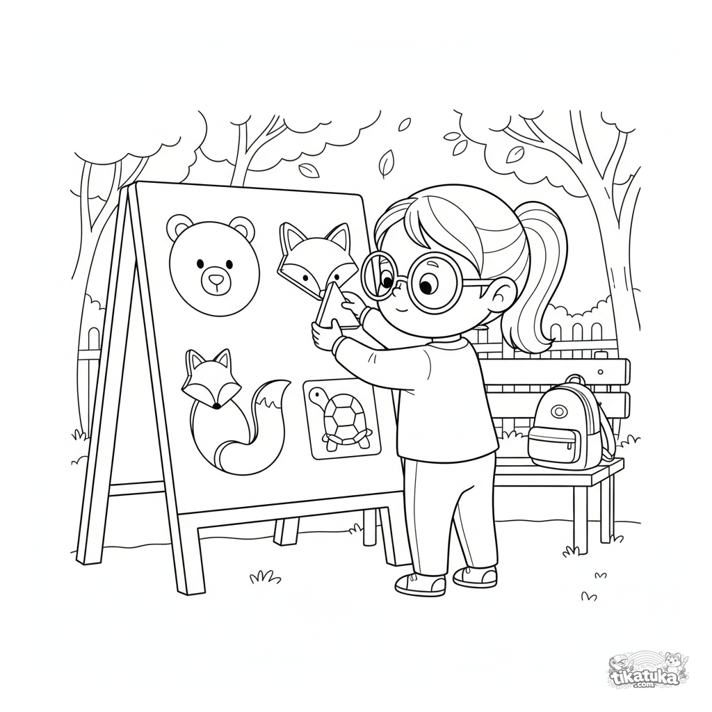 Página para colorir para crianças de 7-9 anos: uma criança associa formas a silhuetas de animais em um quadro educativo. Detalhe moderado.