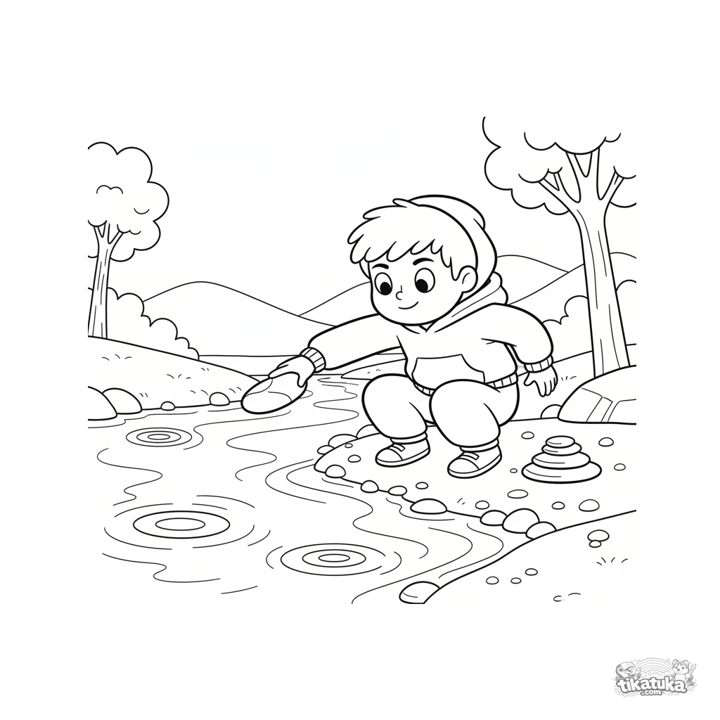 Página para colorir para crianças de 7-9 anos: uma criança saltando pedras em um riacho. Pose dinâmica, passatempo de verão no estilo cartoon dos anos 90.