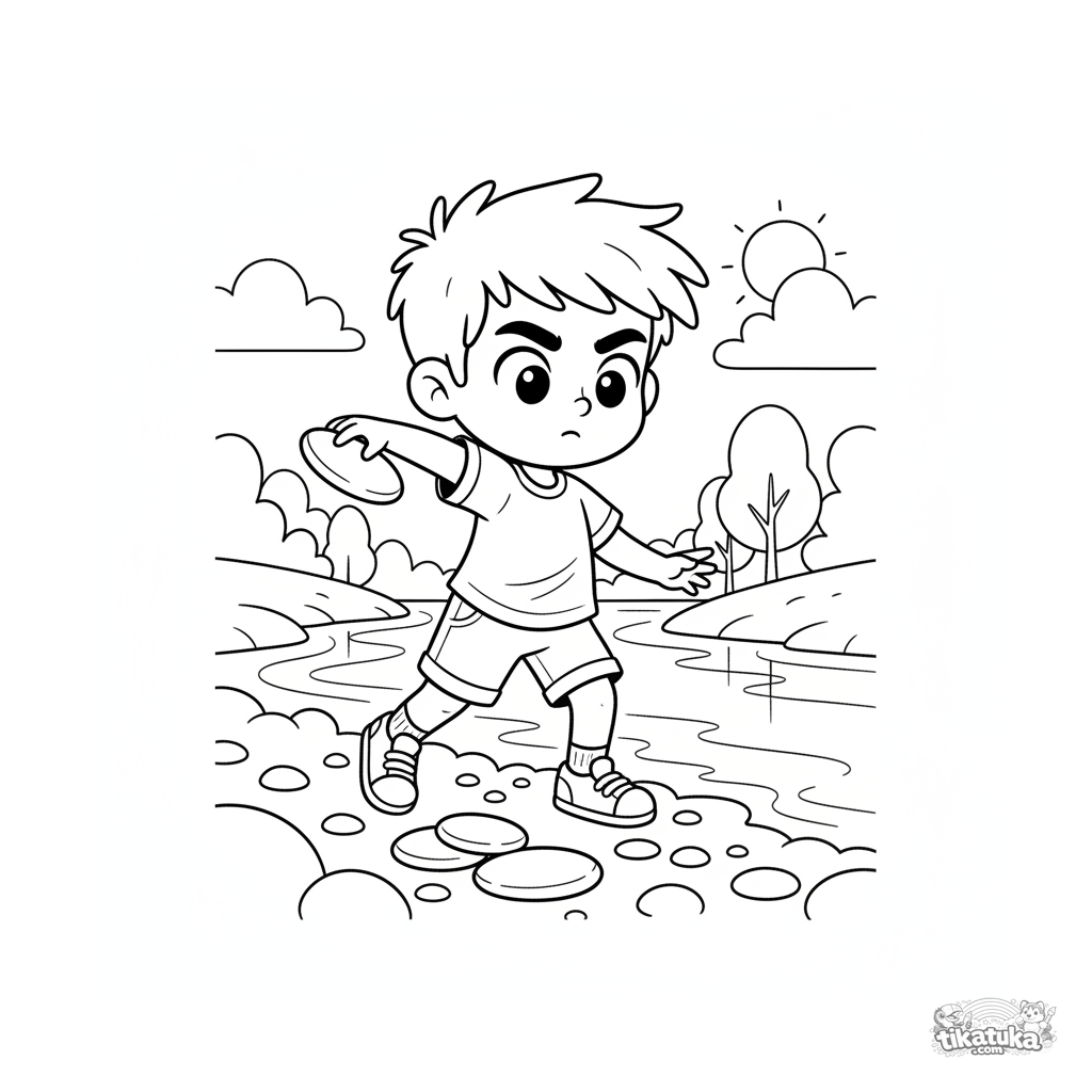 Página para colorir divertida para crianças 4-6: uma criança no estilo cartoon dos anos 90 atirando pedrinhas num riacho claro. Cena dinâmica de brincadeira.