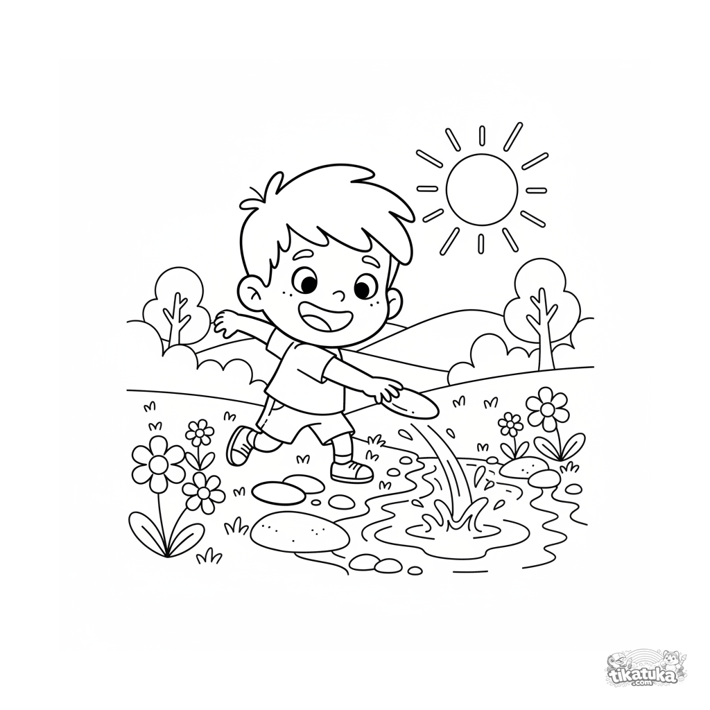 Página para colorir para 7-9 anos: uma criança alegre está saltando uma pedra plana na superfície de um riacho ensolarado. Cena dinâmica e alegre ao ar livre.