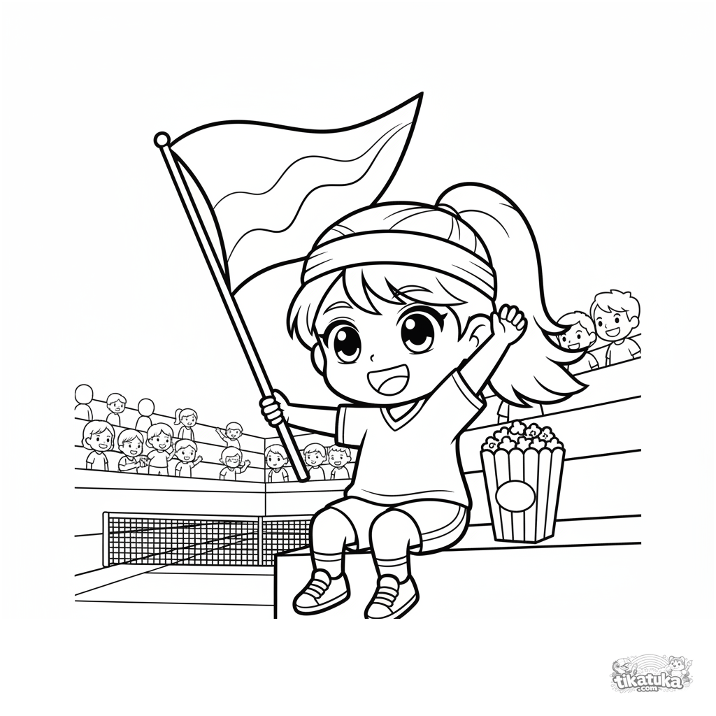 Página para colorir para crianças de 7-9 anos: jovem torcedor acenando bandeira nas arquibancadas do estádio de tênis. Emoções expressivas, detalhe moderado.