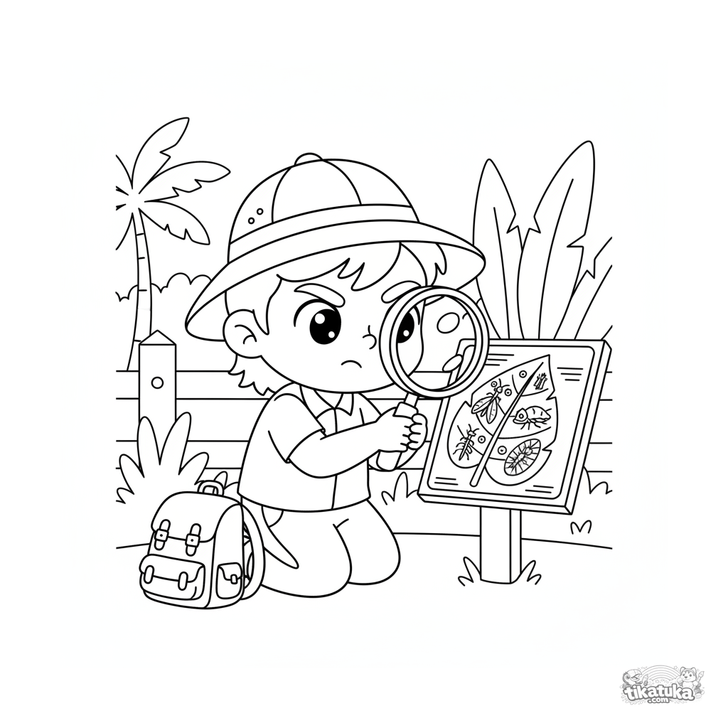 Página para colorir para crianças 7-9: um jovem explorador com uma lupa estuda uma placa sobre camuflagem de insetos no zoológico. Cena de descoberta e aprendizado.