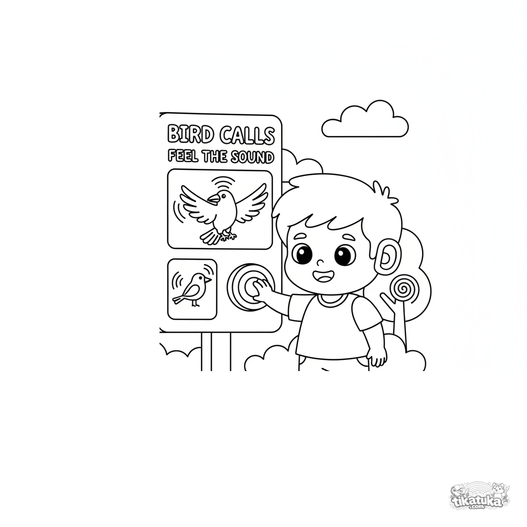 Página para colorir para crianças 4-6: uma criança com aparelho auditivo aprende sobre cantos de pássaros em uma placa tátil com padrões de ondas sonoras.
