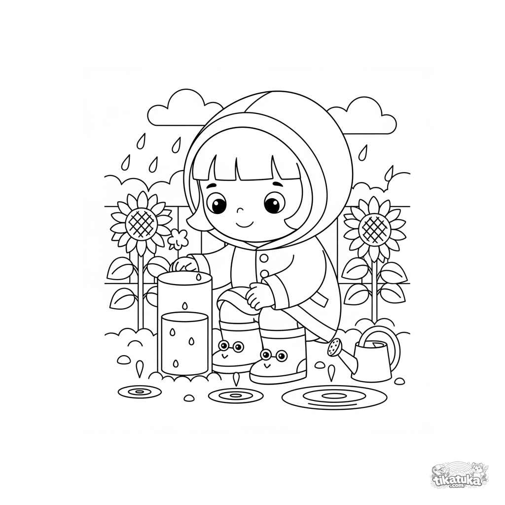 Página para colorir para crianças de 4-6 anos: uma criança examina um pluviômetro no jardim durante a chuva de outono. Detalhe moderado, formas geométricas claras.