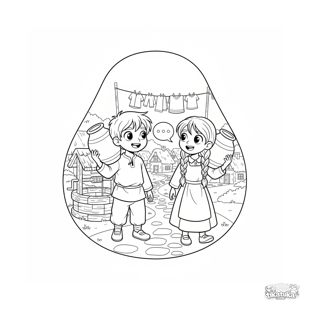 Página para colorir para crianças 4-6: um menino e uma menina carregando jarros de água do poço. Doce cena em estilo de livro de histórias.