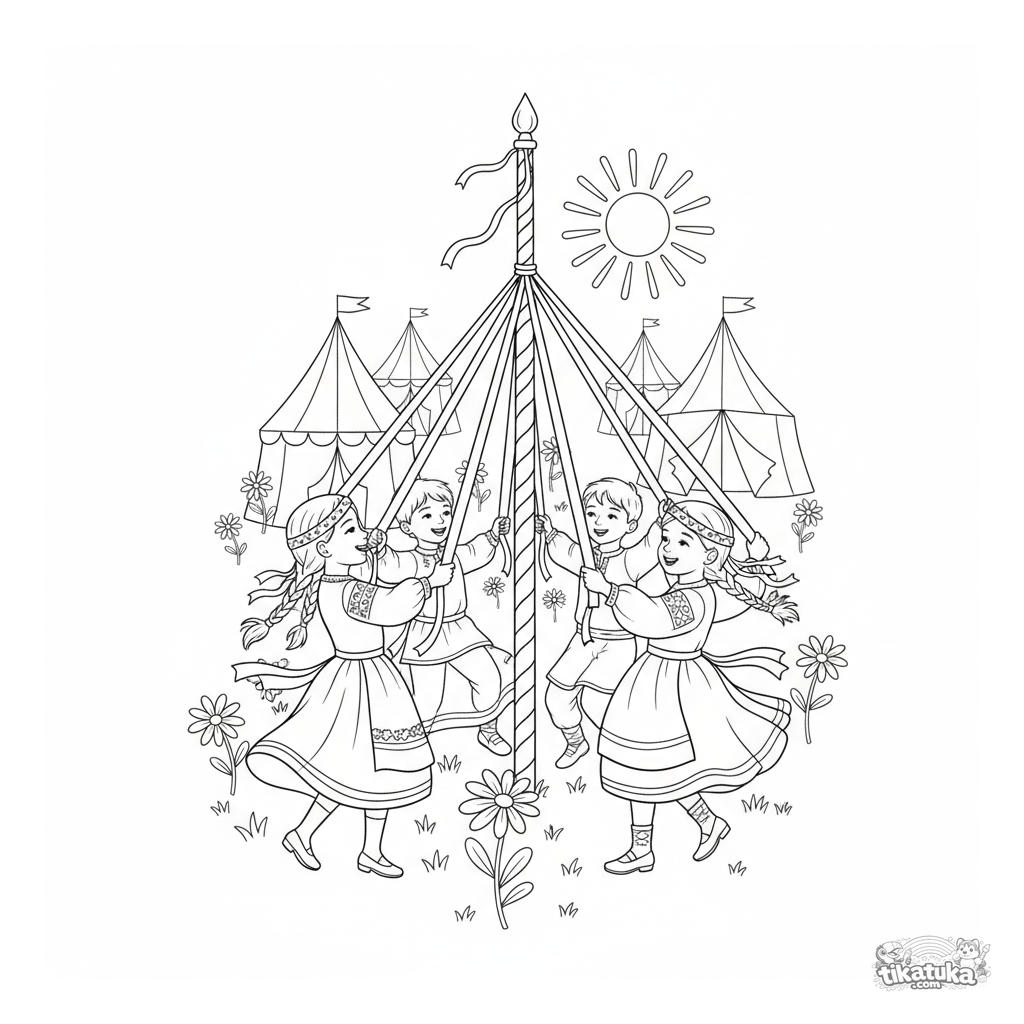 Página para colorir para crianças 4-6 anos: crianças felizes em trajes folclóricos dançam com fitas ao redor de um mastro de maio. Cena folclórica vibrante.