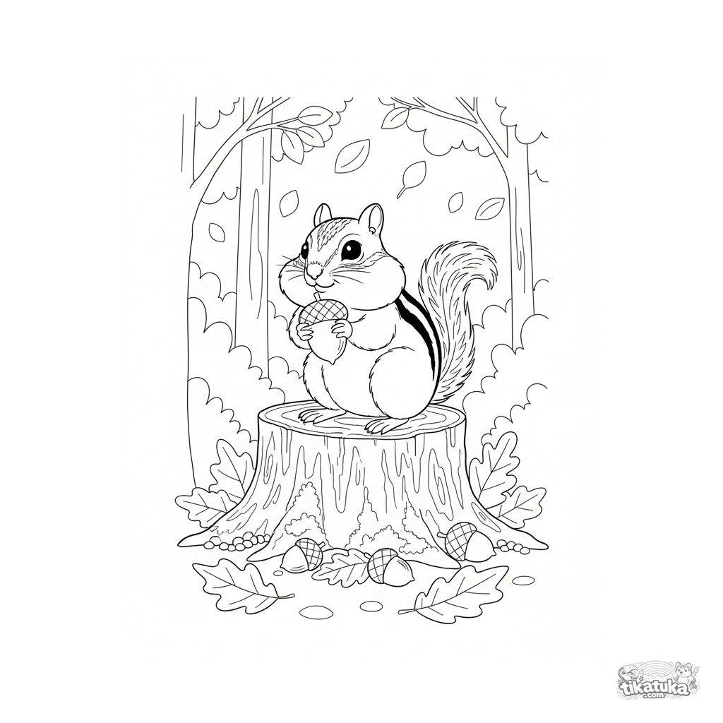 Página para colorir para crianças de 4-6 anos: um esquilo-listrado senta-se num toco musgoso numa floresta de outono segurando uma bolota.