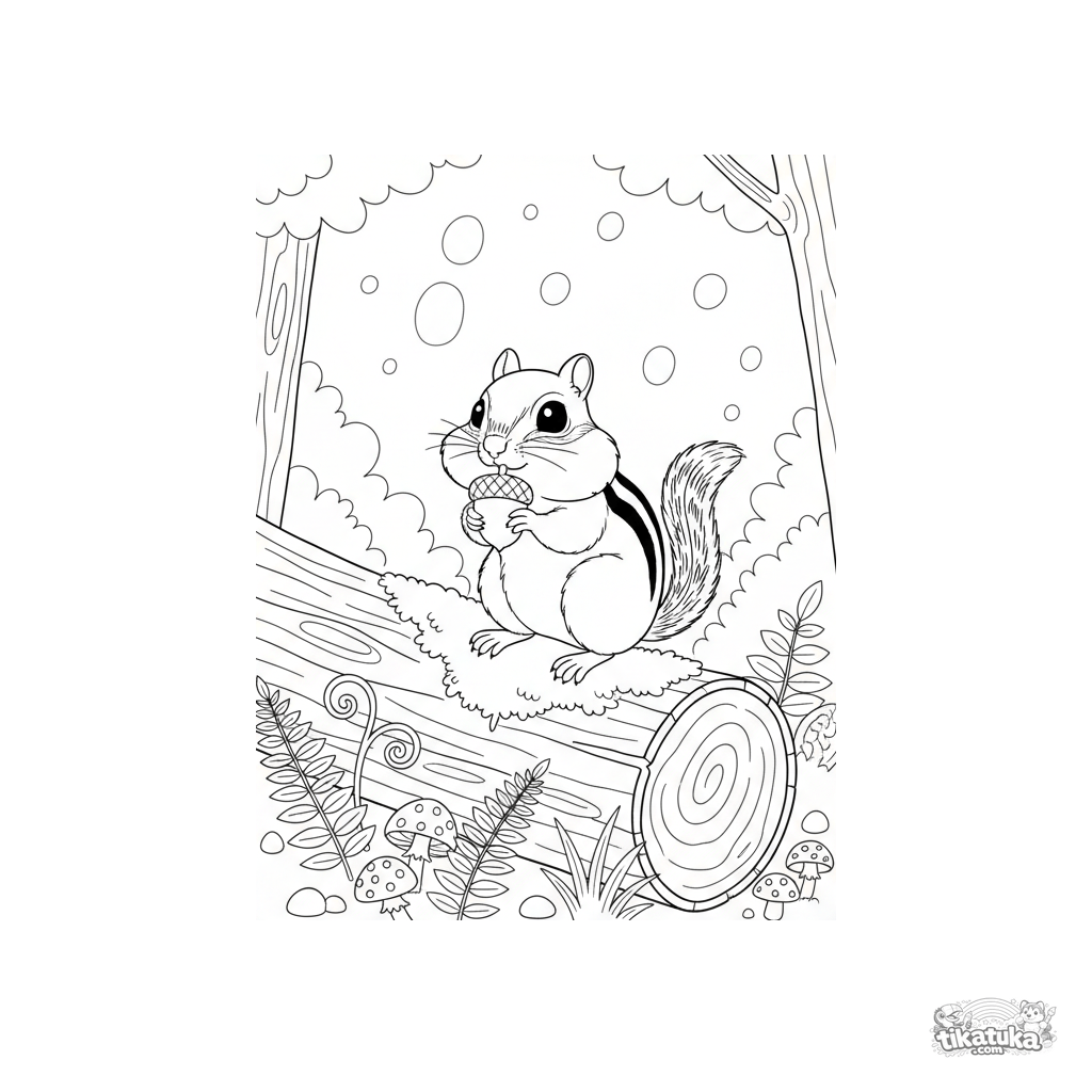 Página para colorir de um esquilo listrado segurando uma bolota em um tronco musgoso. Para crianças de 4 a 6 anos. Cena natural detalhada.