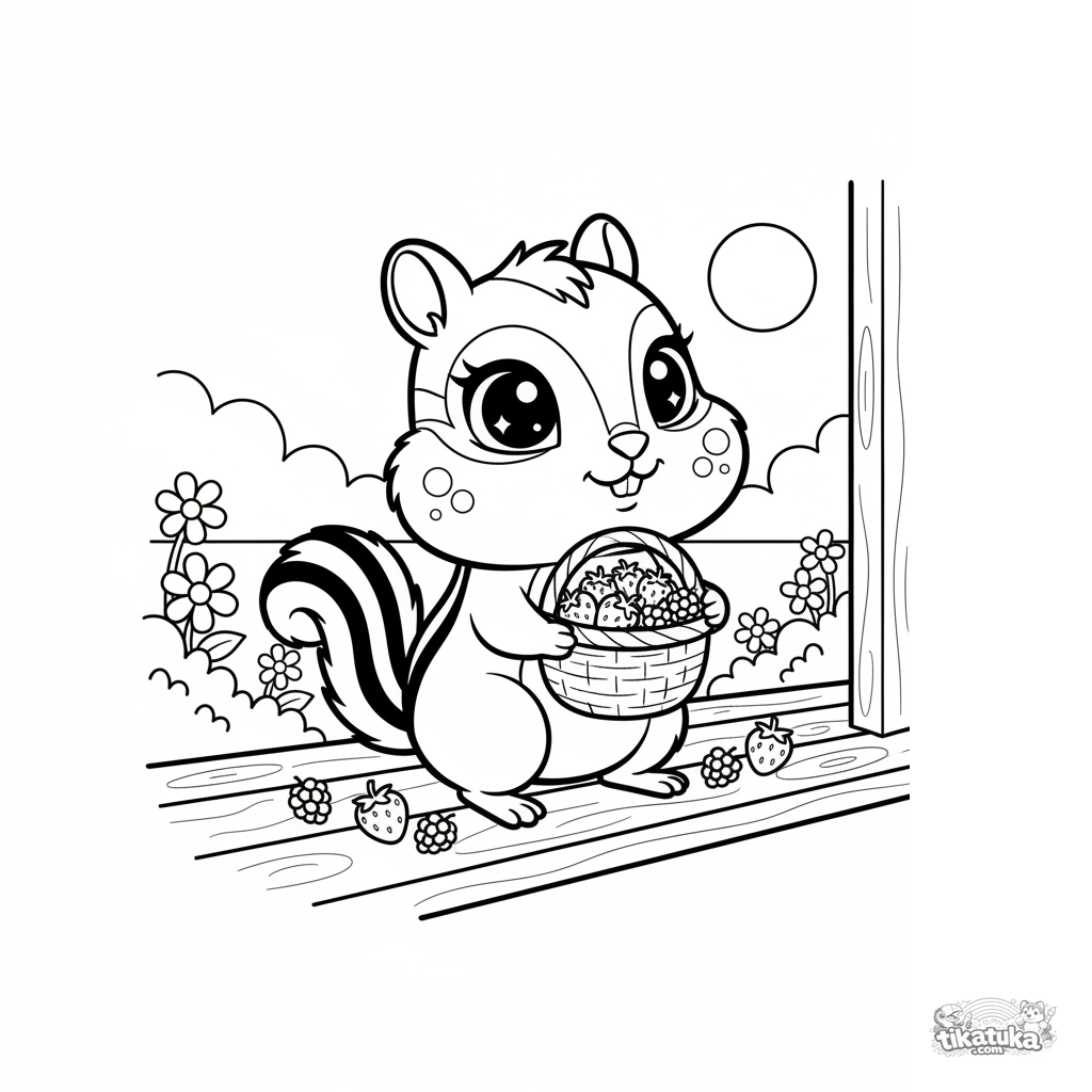 Página para colorir fofa para crianças: um esquilo-listrado com uma cesta de frutas no corrimão de uma varanda de verão. Estilo chibi, olhos grandes.