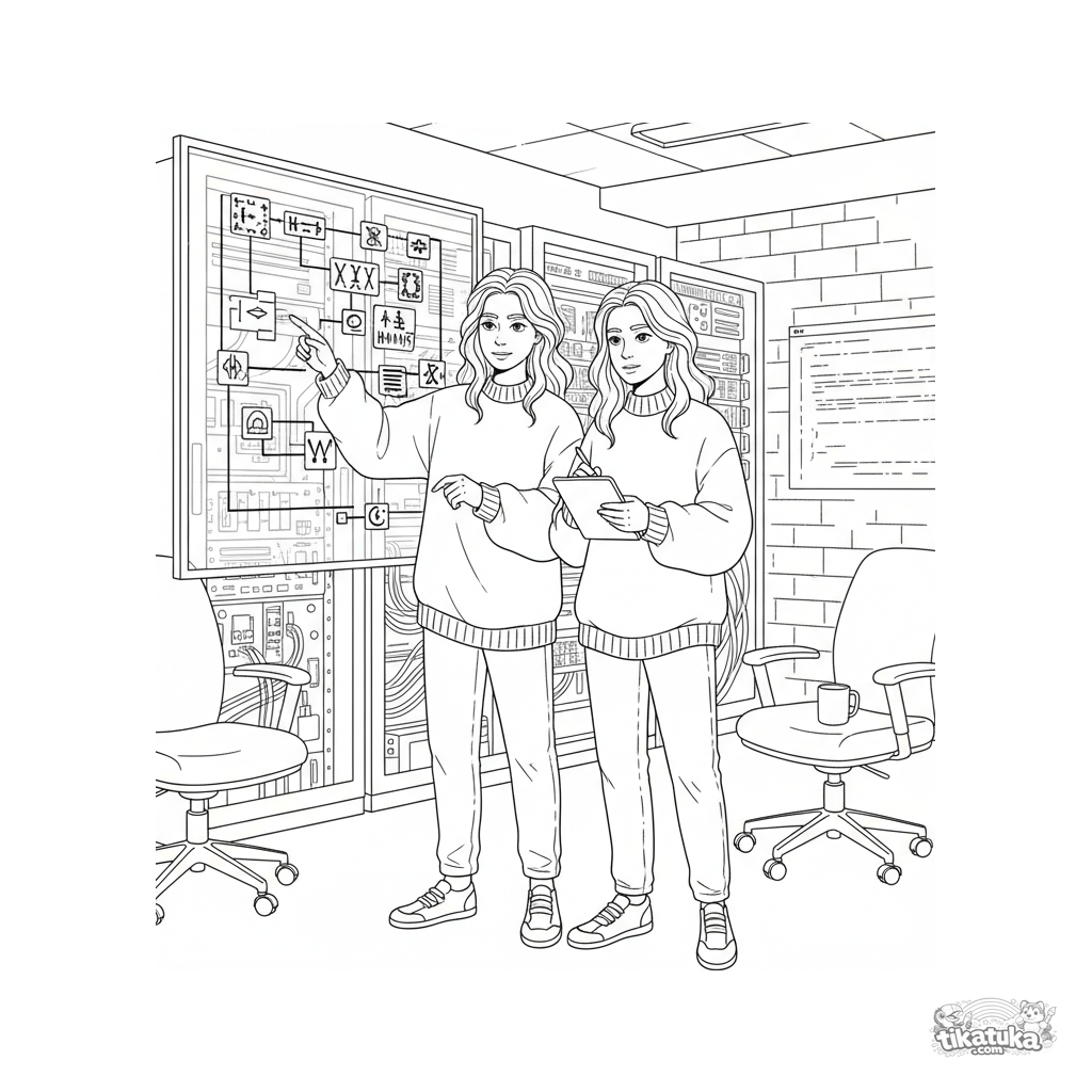 Página para colorir para crianças 10-12: dois decifradores analisam um diagrama de rede complexo em um quadro de vidro em um porão com servidores. Detalhes: marcadores, tablet, cadeiras.