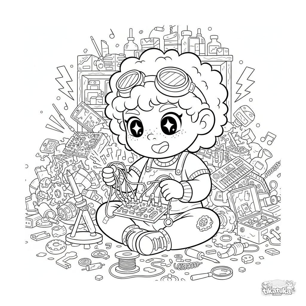 Página para colorir para crianças de 10-12 anos: um inventor modifica brinquedos eletrônicos para criar novos sons em um laboratório no porão. Cena divertida em estilo caderno de rabiscos.