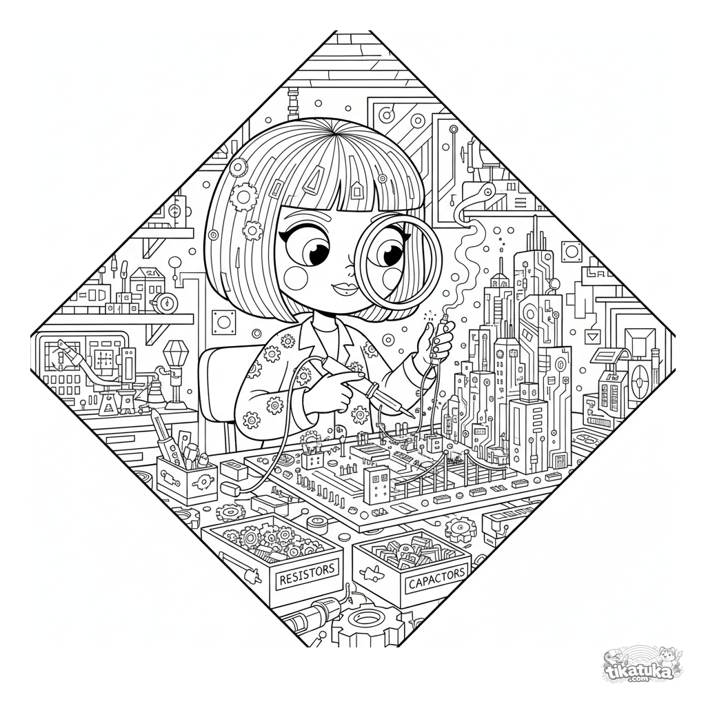 Página para colorir estilo construtivista: um artista criando uma obra de arte com placa de circuito em um porão hacker. Formas geométricas, muitos detalhes de componentes eletrônicos para 10-12 anos.