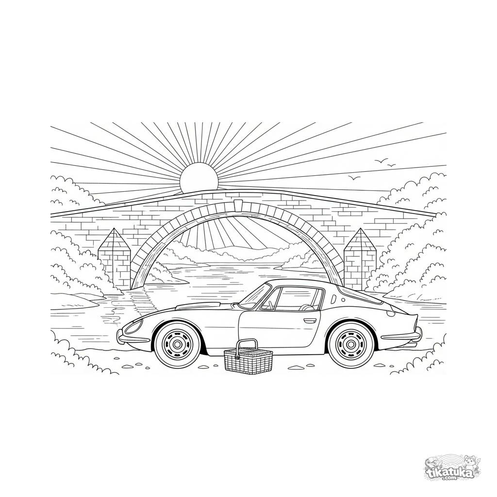 Página para colorir detalhada para 10-12 anos: um carro esportivo clássico dos anos 60 estacionado em uma ponte de pedra sobre um rio ao anoitecer. Perfeito para entusiastas.