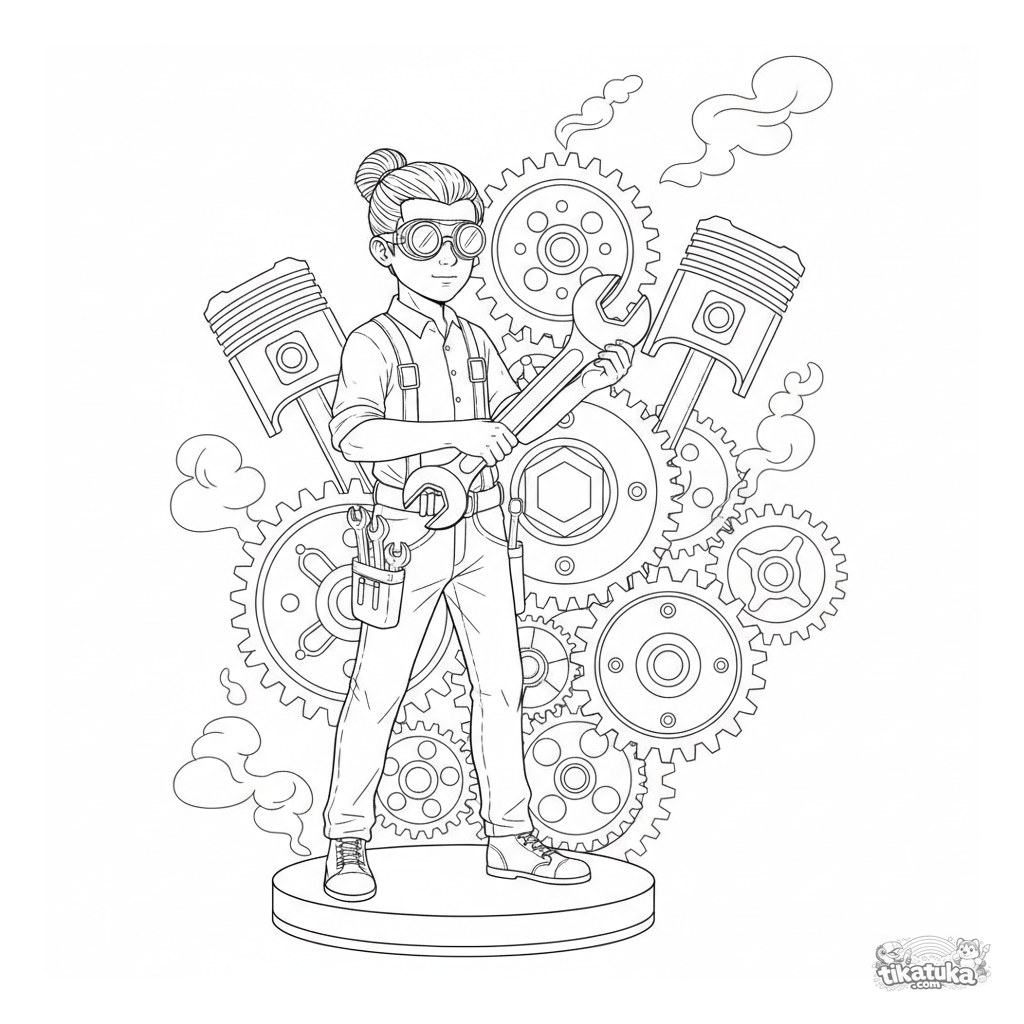 Página complexa estilo gravura para crianças de 10-12 anos: um engenheiro ajustando um mecanismo de engrenagem gigante em um laboratório a vapor.