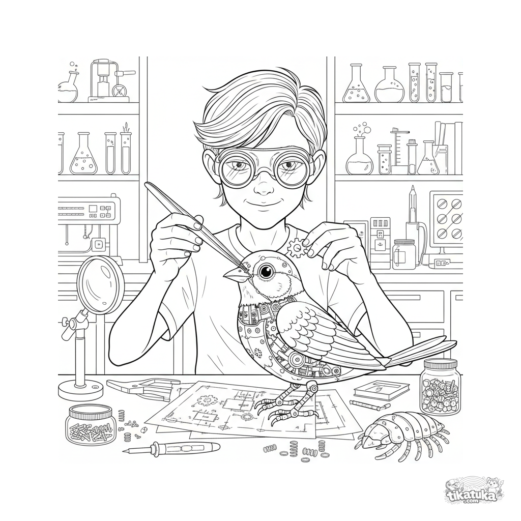 Página para colorir para crianças 10-12: um jovem relojoeiro em um laboratório secreto monta um complexo autômato pássaro mecânico. Cena detalhada com engrenagens e ferramentas.