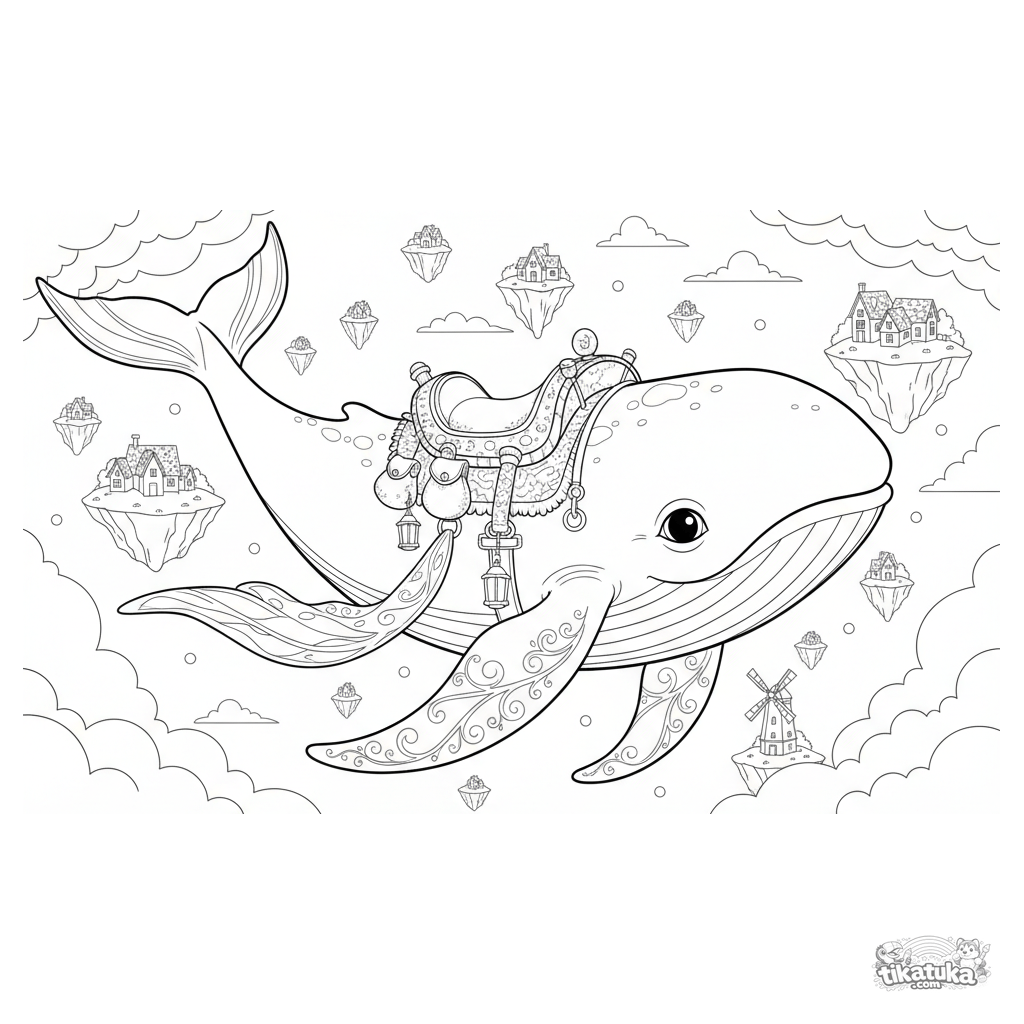 Página para colorir para 10-12 anos: uma majestosa baleia de nuvens nada sobre ilhas flutuantes. Cena de fantasia detalhada.