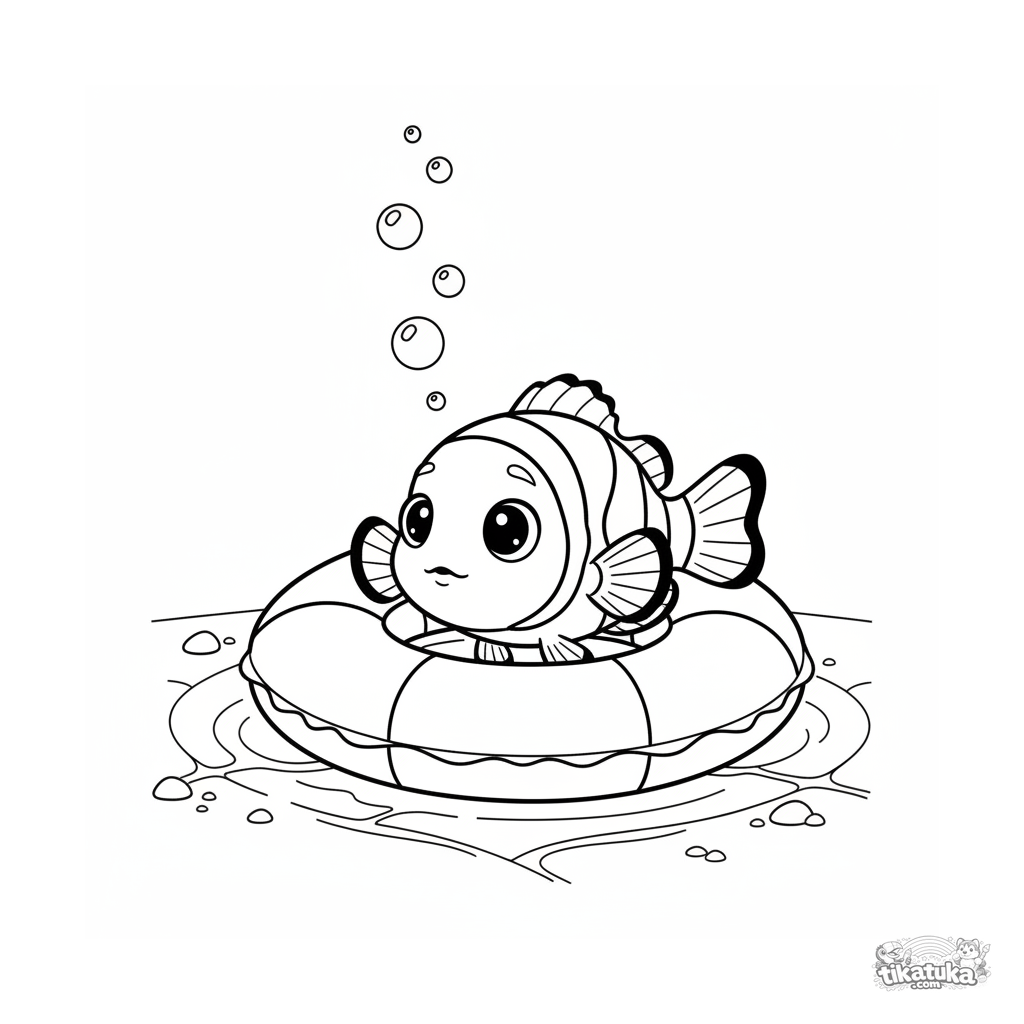 Página para colorir para crianças 7-9: um peixe-palhaço listrado espreita timidamente de dentro de um anel. Formas suaves, cena fofa.