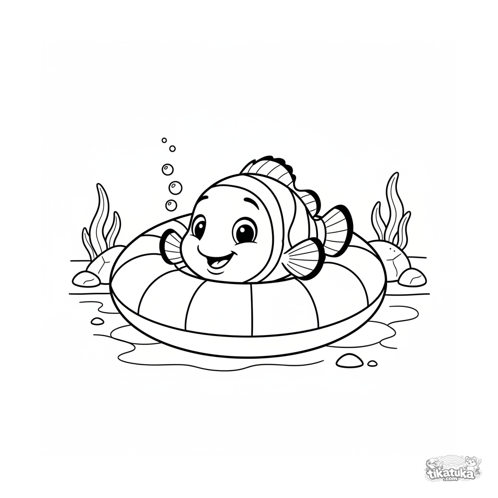 Página para colorir para pré-adolescentes 7-9: um peixe-palhaço brincalhão espreita do túnel de um anel inflável no fundo da piscina. Rosto expressivo, composição emoldurada.