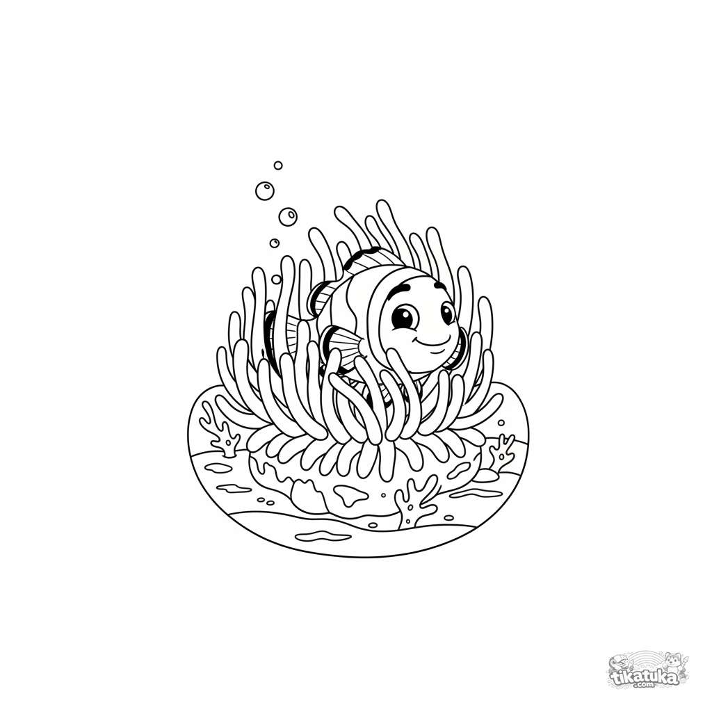 Página divertida para colorir estilo anos 90: peixe-palhaço espiando de uma anêmona em um recife ensolarado. Para crianças de 4 a 6 anos.