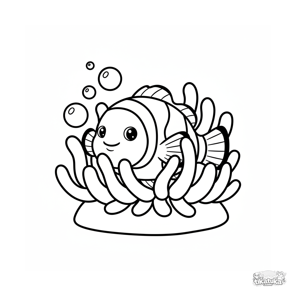 Página para colorir simples para crianças de 2-3 anos: um peixe-palhaço espiando de uma anêmona em uma rocha ensolarada.