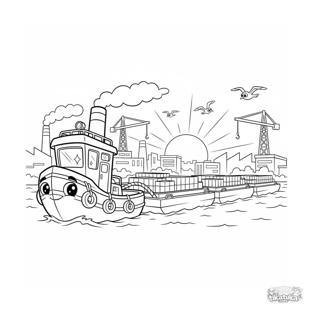 Página para colorir para 7-9 anos: um rebocador com chaminé empurra barcaças carregadas em um porto ao pôr do sol. Gaivotas, cordas, cena de trabalho detalhada.