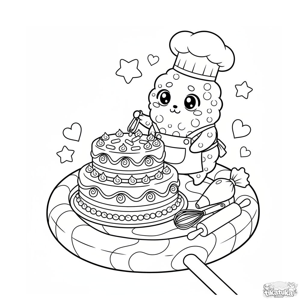 Página para colorir para crianças 4-6: um micróbio em forma de aglomerado de chapéu de chef decora um bolo em um pirulito. Cena fofa no estilo kawaii com ferramentas de confeitaria.