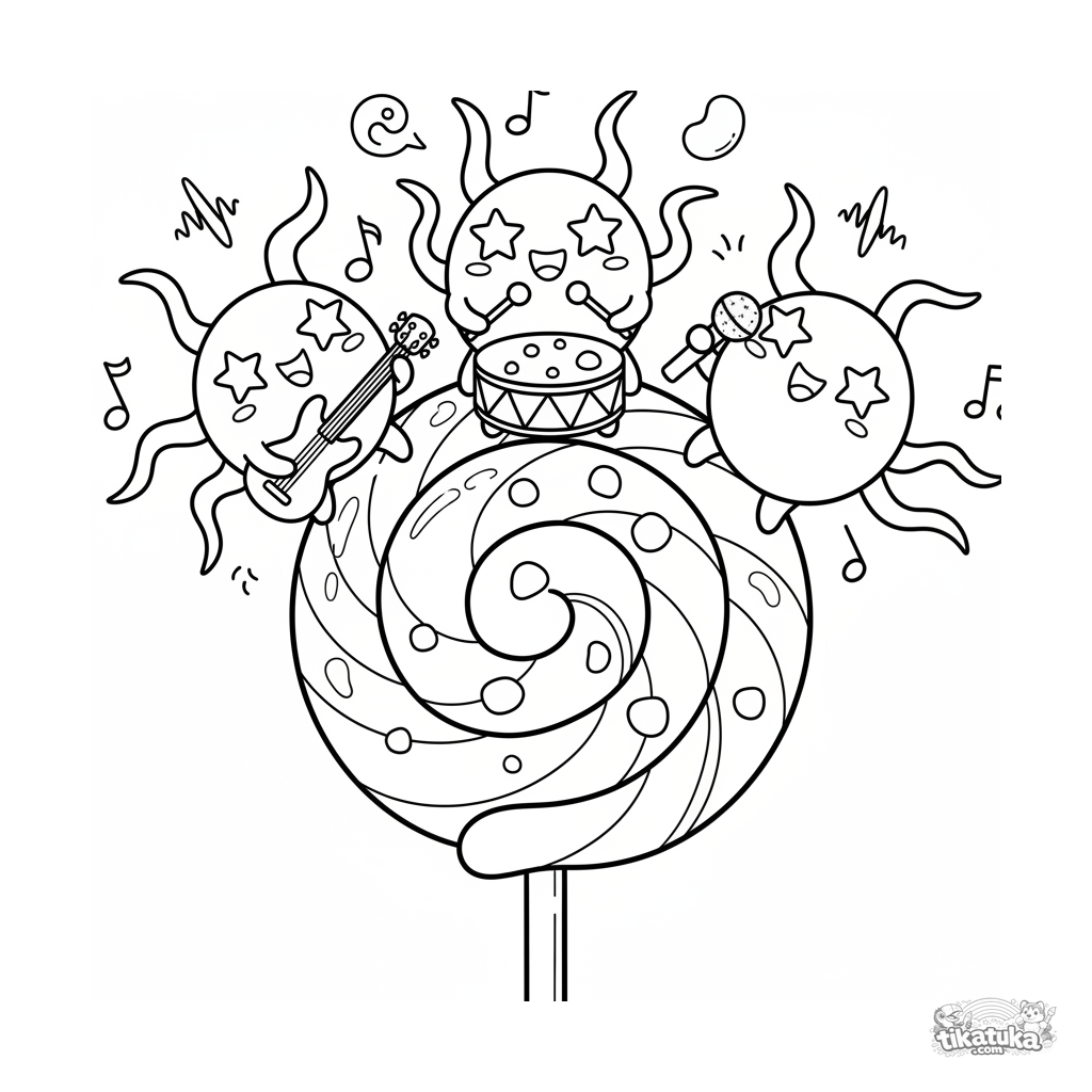 Página para colorir para crianças de 7-9 anos: uma banda de micróbios divertida toca música em um pirulito arco-íris. Estilo pop-art vibrante, notas musicais flutuantes.