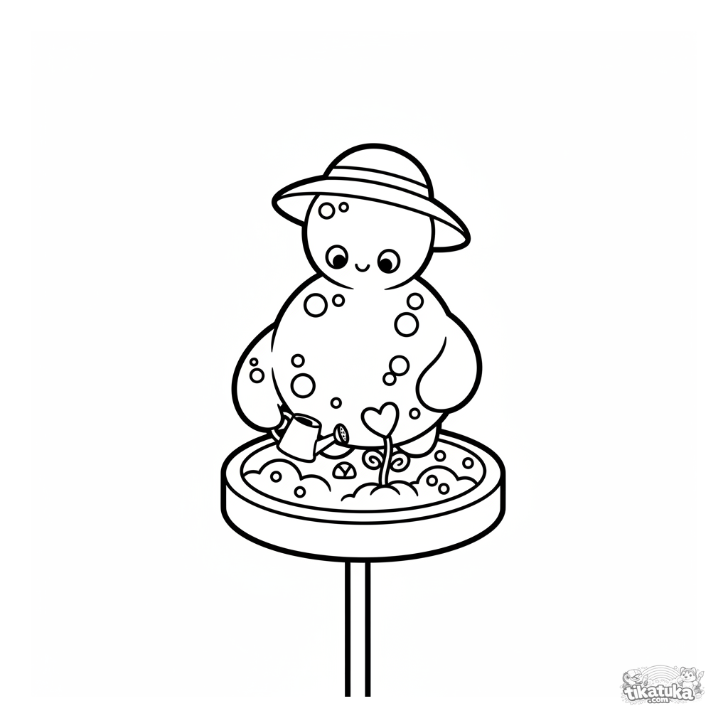 Página para colorir simples para bebês 2-3: um micróbio em cacho com chapéu rega uma florzinha num pirulito. Formas grandes e claras.