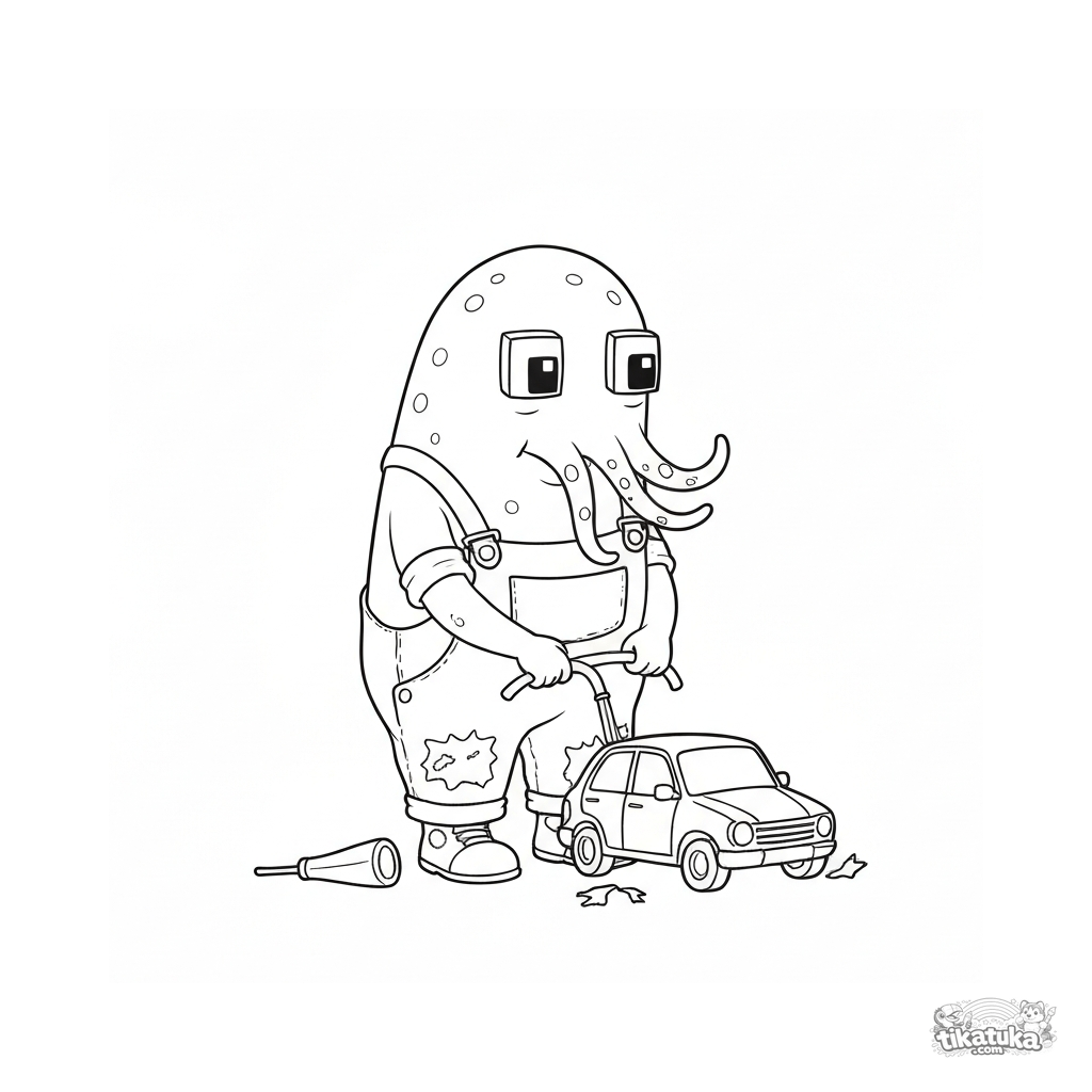 Página para colorir para crianças de 8-12 anos. Micróbio mecânico com tentáculos e olhos de pixel consertando um carro pequeno. Download grátis.