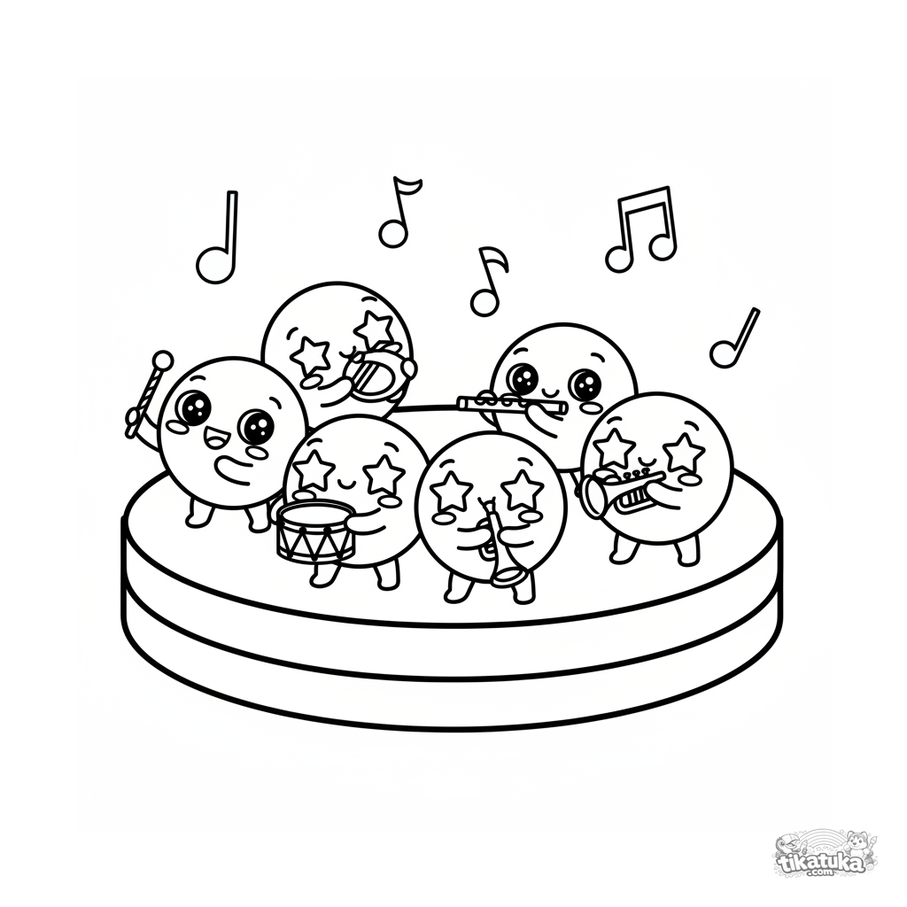 Página simples para colorir para crianças pequenas de 2-3 anos: um grupo alegre de micróbios cocos redondos toca instrumentos em um palco de pirulito. Formas grandes.