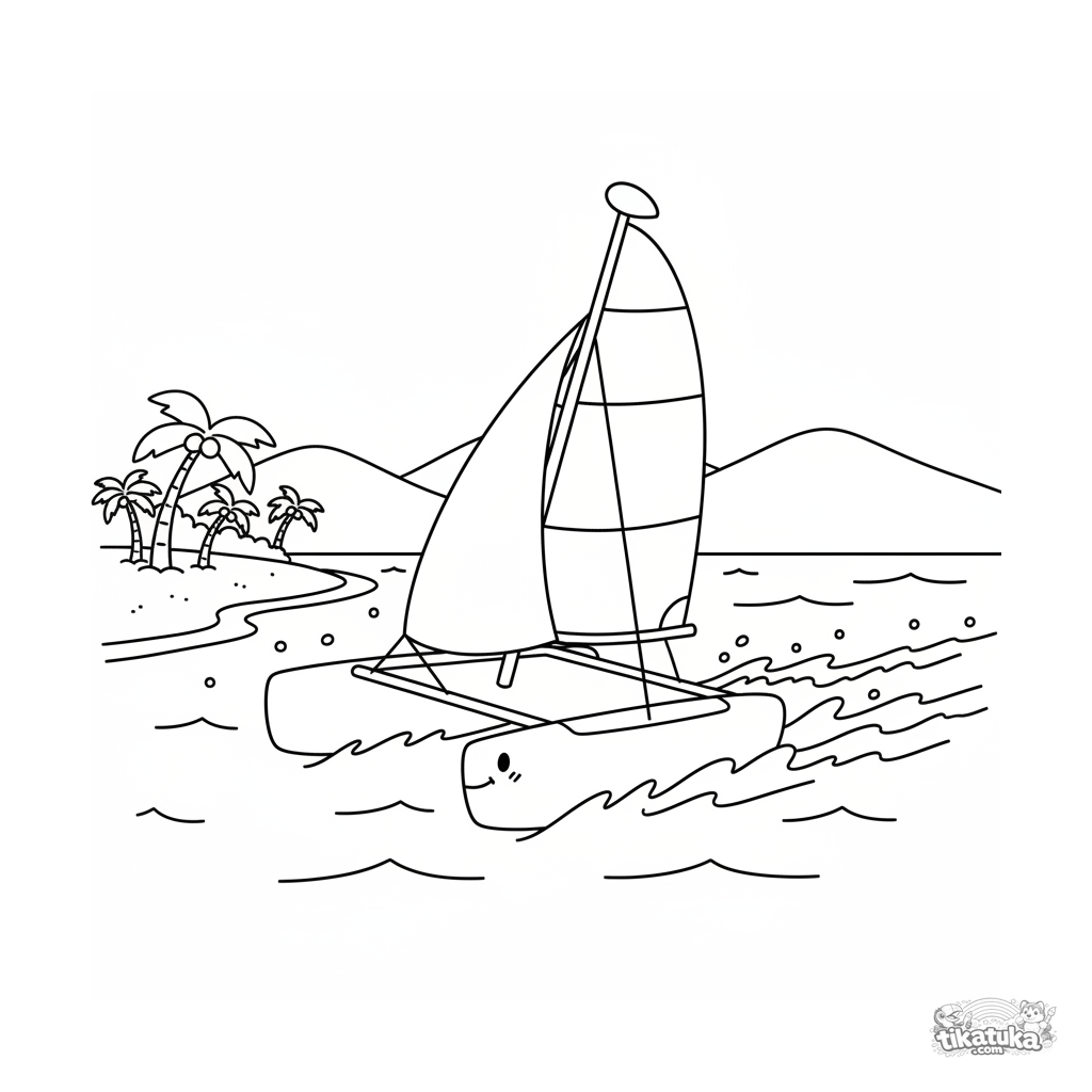 Página para colorir para 7-9 anos: um catamarã de corrida elegante desliza sobre a água turquesa de uma baía tropical. Desenho brilhante e dinâmico com coqueiros na praia.