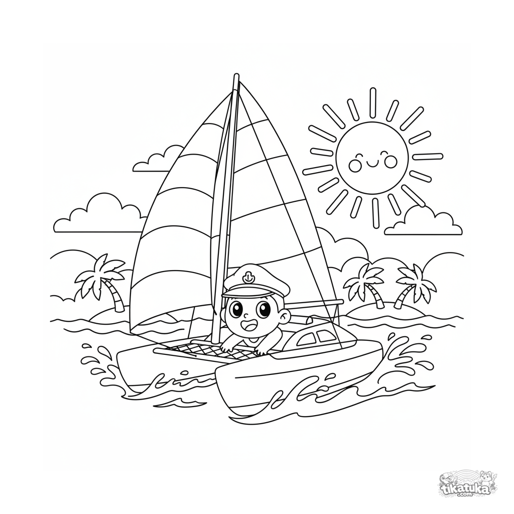 Página para colorir para pré-adolescentes de 7-9 anos: um catamarã rápido com velas listradas corre em uma baía tropical. Um marinheiro se inclina, ilhas com coqueiros ao fundo.